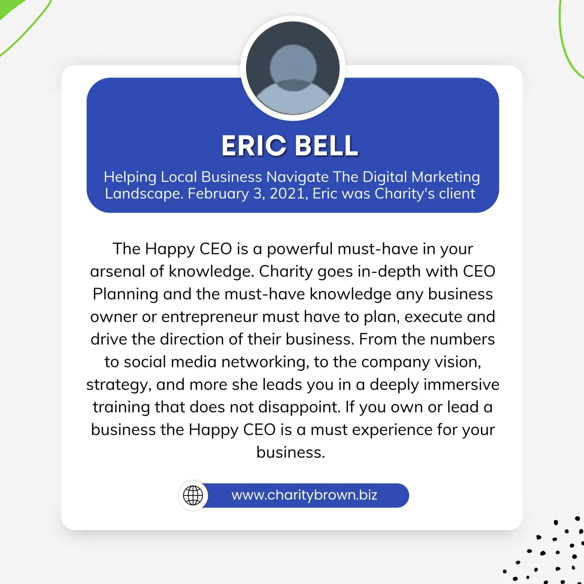 " Charity really helped me take my business from a $1.7 million dollar a year business to a $4.5 million dollar business"